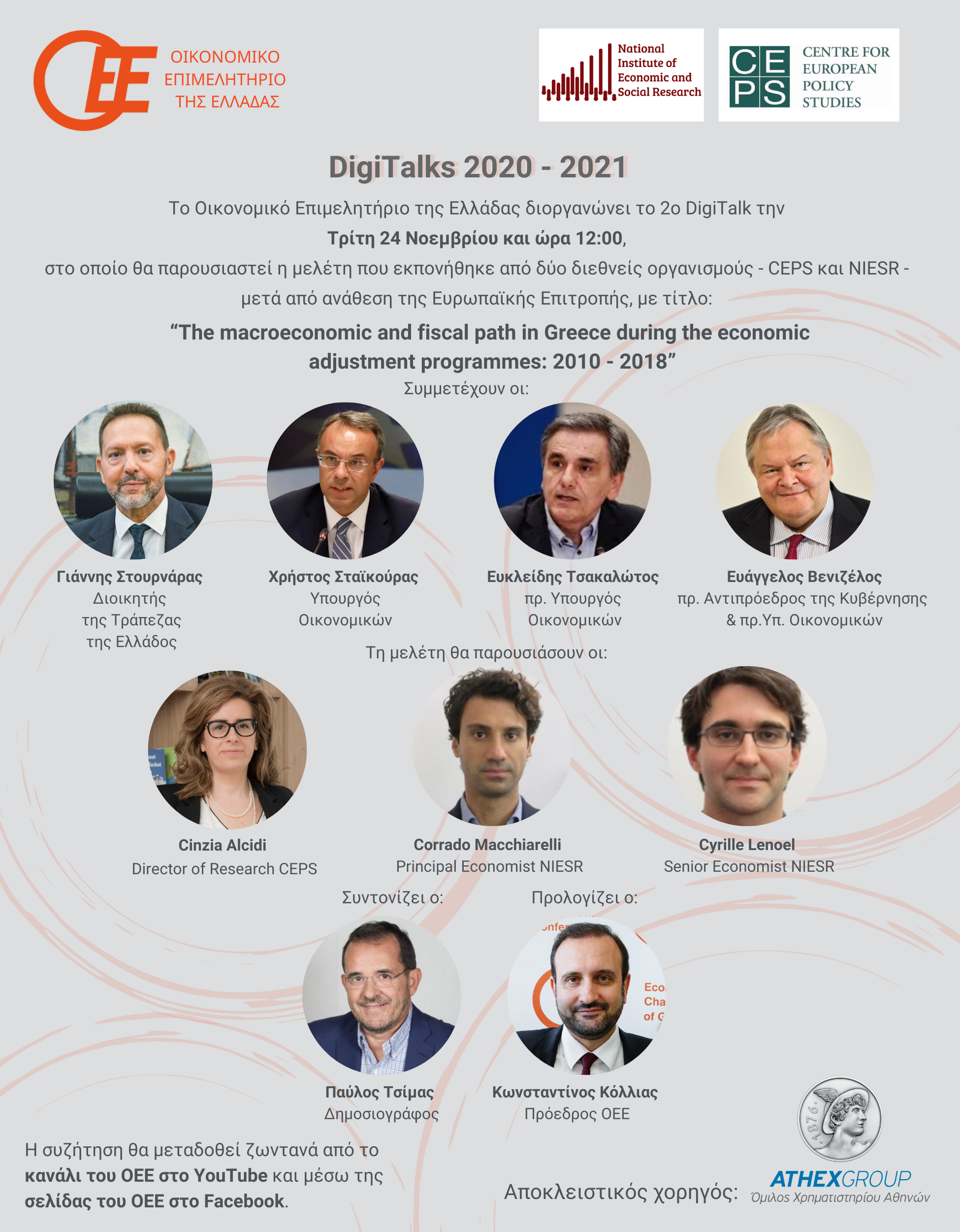 Το μακροοικονομικό και δημοσιονομικό μονοπάτι στην Ελλάδα κατά τη διάρκεια των προγραμμάτων οικονομικής προσαρμογής, 2010 – 2018, είναι το θέμα της μελέτης, που θα παρουσιαστεί στο 2ο Digitalk του Οικονομικού Επιμελητηρίου Ελλάδος, την Τρίτη, 24 Νοεμβρίου 2020, στις 12:00.